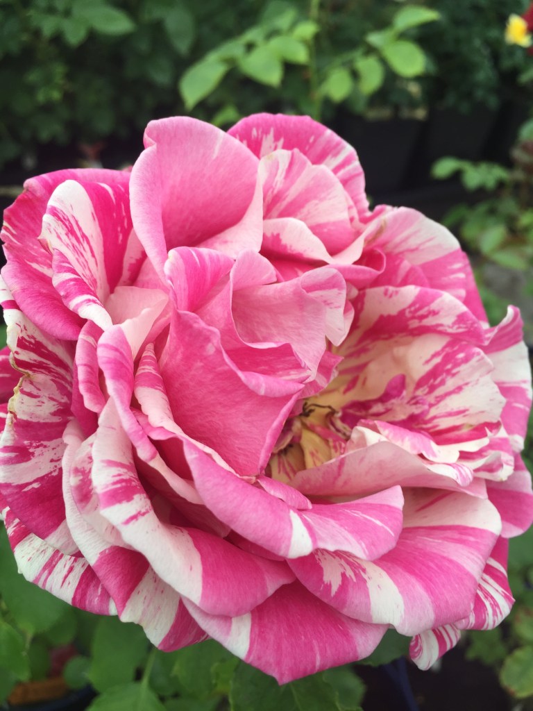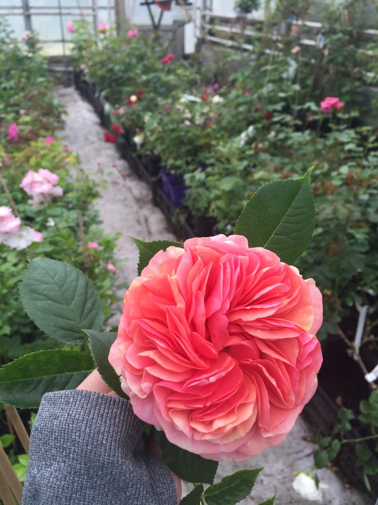 Walking through the greenhouse I found the names of roses as interesting as the roses themselves, like the ‘Carefree Spirit’ – a shrub rose noted as a ‘breakthrough” among rose-ologists for its great disease resistance. Then there’s the Winchester Cathedral, and the Busy Bee rose. There is the Flutterbye, the Magician and the Burgundy Iceberg, which is a gothy dark red. There’s the russet colored Butterscotch rose, and the Café Olé and the Cinco de Mayo; the Denver’s Dream (a cool bicolor orange), the funky Distant Drums (a striking mauve/tan). There is the Heidi Klum rose, naturally, and there is a Portland Rose – probably because the city of Portland has been nicknamed “City of Roses” (like Pasadena and Guadalajara) and I wish I could send a hundred dozen to the poor beleaguered people of that good city.