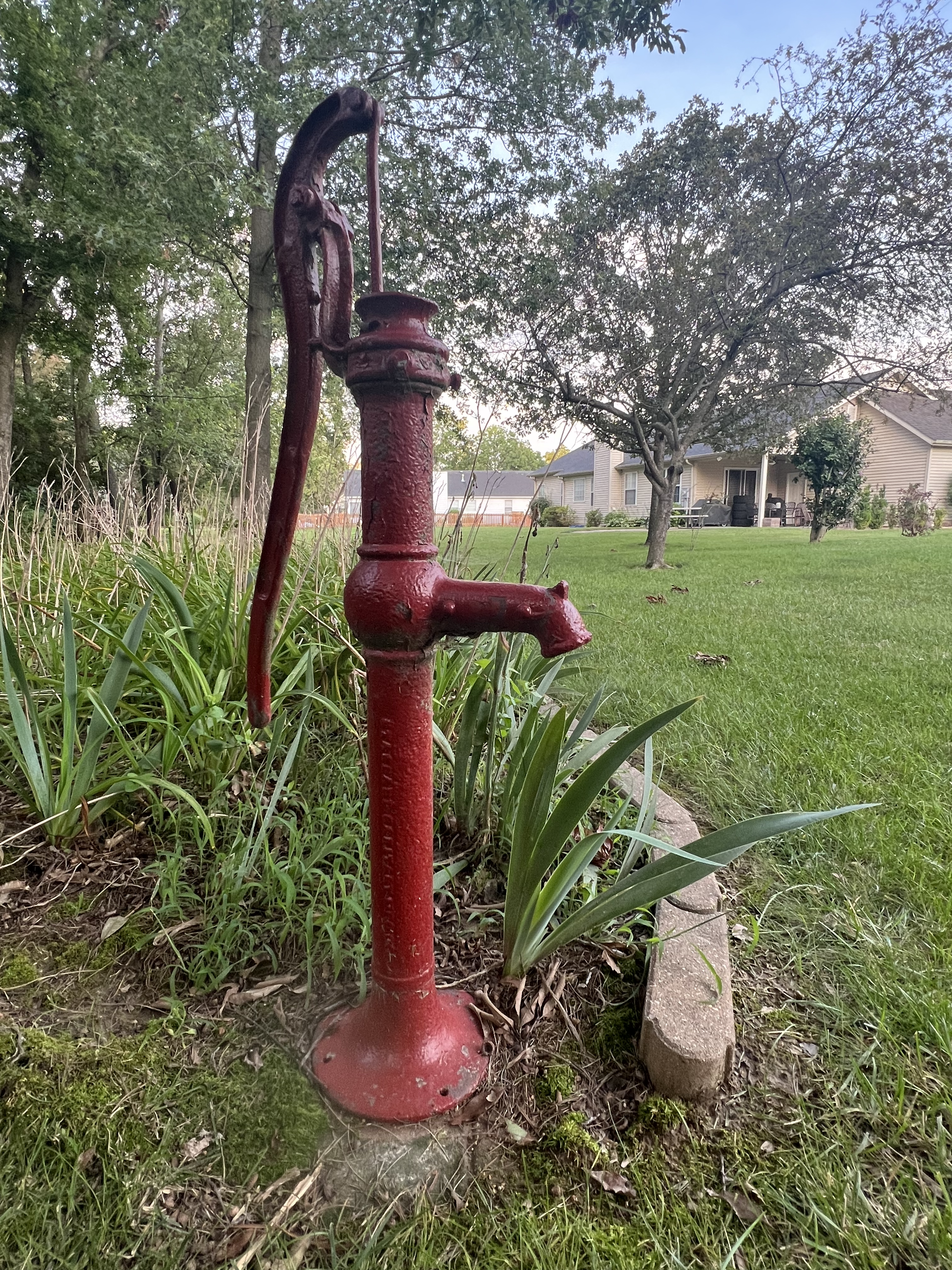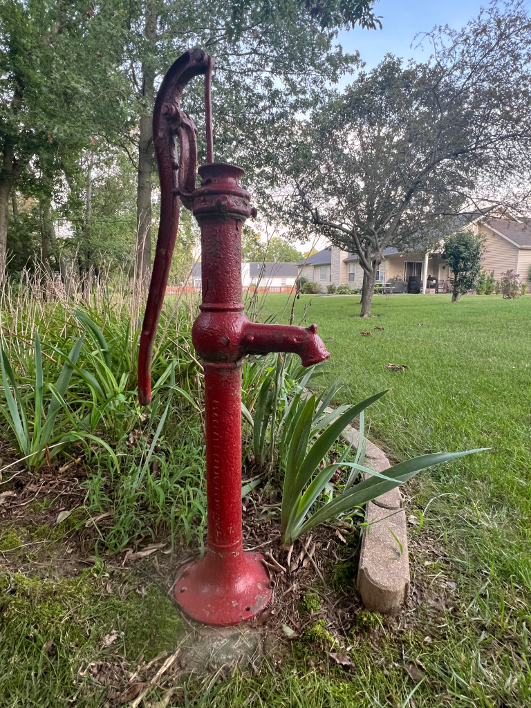 Dad had a hard time leaving that house, in part because he’d put so much of himself into it, but also in part because he’d dug a koi pond in the backyard, landscaping a tranquil little garden around it. He spent a lot of time back there with those fish. and developed such an attachment to them that he went back and visited them after he moved away. They miss me, he told me. We tried to get him to build a new koi pond at the new place but dad didn’t want new fish, he wanted the fish he’d been caring for, the fish that recognized him. I get it. He built a new garden around the garden ornaments he’d accumulated, including a red pump handle. And it was, in many ways, more beautiful than the garden he left behind, but I know it didn’t make him feel any better about his fish.